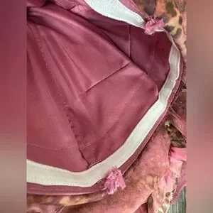 Faviana New York strapless chiffon dress featuring a structured boned bodice for a flattering fit. Designed with diagonal panels in rose and burgundy tones with subtle animal print. The skirt has layered ruffles that add soft movement and a feminine look.