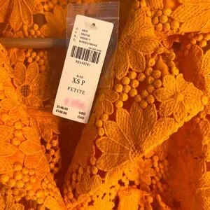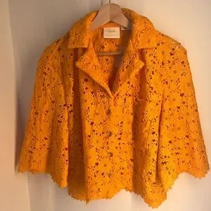 Vibrant orange/yellow floral lace button-down blouse. Short sleeve design with scalloped lace hem. Feminine collar and functional buttons. Oversized fit. Actually extra small but fits like a medium.