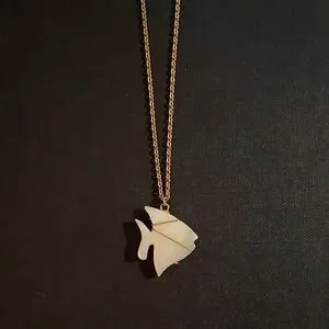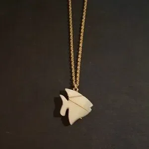 Elegant gold chain featuring a cream fish pendant. Perfect for adding a unique touch to any outfit.