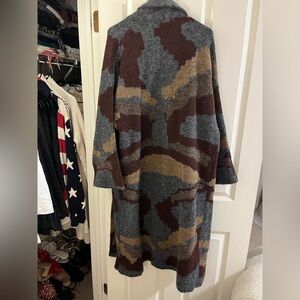 Open-front knit coatigan with a relaxed long silhouette. Camouflage-inspired pattern in gray, brown and tan. Soft textured knit for layered comfort. Features discreet front pockets and dropped shoulders. Easy-to-wear piece for casual styling.