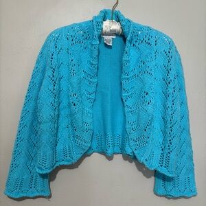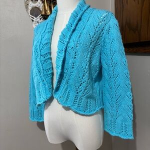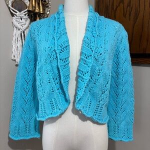 Vtg Blue Crochet Knit Open Front Cardigan Shrug Size Large Ruffles Y2K