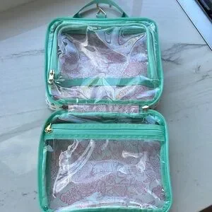 Roller Rabbit cosmetic bag with multicolored heart pattern. Mint straps and trim accent a white body. Structured shape with top handles for easy carrying. Cute, playful print for makeup or travel essentials.
