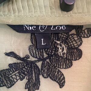 NIC+ZOE Olive Green Ruffle V-Neck Blouse with Black Floral Embroidery