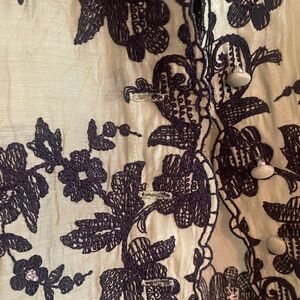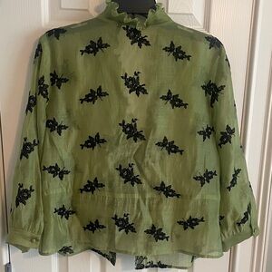 Light olive green blouse with black embroidered floral details. Ruffle-trimmed V-neck for a feminine touch. Three-quarter sleeves and open-front styling. Sheer, breezy fabric for easy layering.