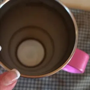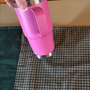 Vibrant hot pink Yeti travel tumbler. Includes clear spill-resistant lid and straw. Comfortable side handle for carrying. Stainless trim and durable build. Keeps drinks hot or cold.