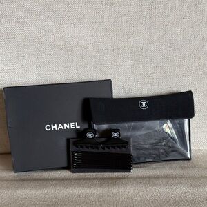 Stylish CHANEL hair accessory set. Features elegant black clips and a sleek pouch.