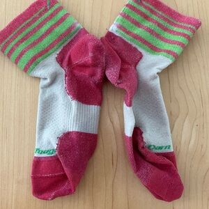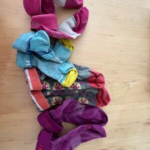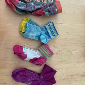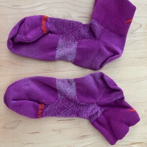 Soft crew socks in vibrant pink, blue, and purple. Breathable knit with stretchy cuffs for a secure fit. Fun stripe and color-block details add playful style for everyday wear. Machine-friendly fabric for easy care. Womens size medium wool blend crew socks.