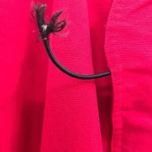 There is some fabric wear on the front and one of the cords on the pockets is broken. Both are pictured.
