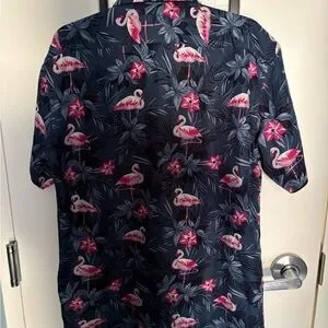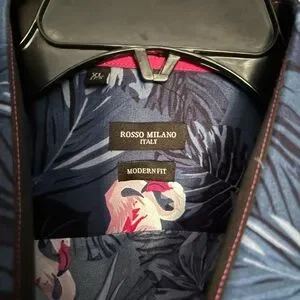The Rosso Milano Blue Floral Short Sleeve Button-Up Shirt in Men's XL is a stylish and colorful addition to any casual wardrobe. Featuring a collared neckline and button closure, this modern fit shirt is adorned with a vibrant blue, pink, and multicolor floral pattern that adds a touch of Hawaiian and tropical flair. Made by the brand Rosso Milano, this spread collar shirt is perfect for a laid-back yet fashionable look for any occasion.