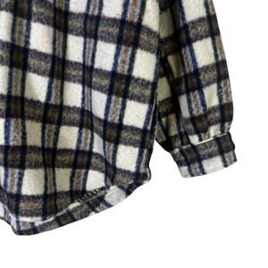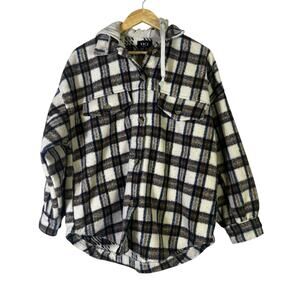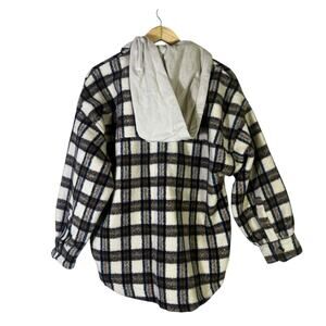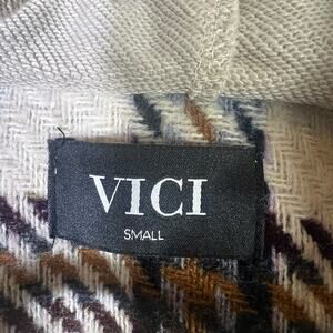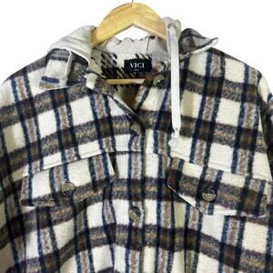 Stylish plaid jacket by Vici. Features black and white check pattern. Brown accents add warmth. Perfect for layering.