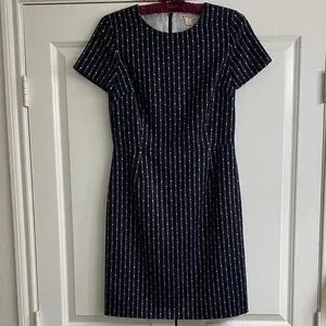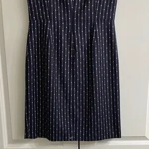 Chic navy dress featuring white dot pattern. Classic fit. Fully lined. Back zipper. Excellent like new condition!