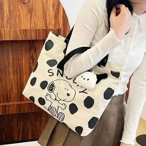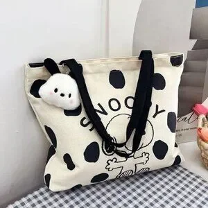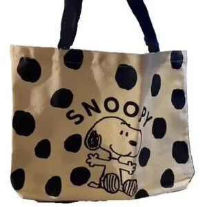 Cute Snoopy canvas tote bag with a black polka dot pattern on a white background. Features a classic Snoopy graphic and includes an attached mini plush Snoopy charm for extra charm.