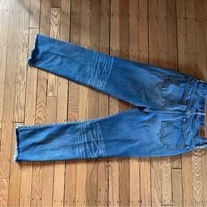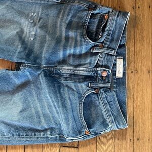 Madewell perfect vintage Jean in medium wash. Very soft with perfect t distressing on legs and cutoff hem. Hits at ankle on 5'8".