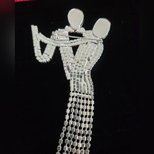 The true highlight is the articulated fringe skirt, which shimmies and catches the light with every movement. Often attributed to the iconic Butler & Wilson aesthetic, this unsigned vintage-style brooch is a masterclass in sculptural costume jewelry.