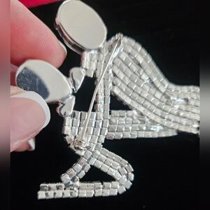 This exquisite figural brooch features a waltzing couple captured in a dramatic dip. The gentleman is elegantly rendered in midnight-jet black crystals, providing a sharp contrast to his partner’s radiant brilliant-cut clear rhinestone gown.