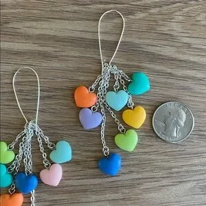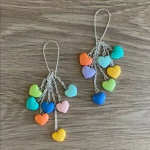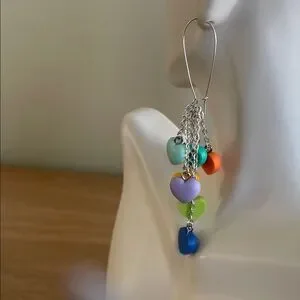 Bring a pop of color to your jewelry collection with these handmade pastel heart dangle earrings. These unique statement pieces feature a fun “waterfall” design, perfect for adding a playful touch to any outfit.