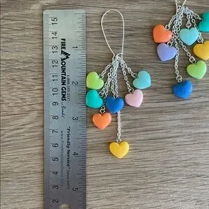 Approximately 4”, including the silver plated pierced kidney-style ear wires. Lengths of silver plated chain end with acrylic pastel hearts. Blue, green, yellow, peach, aqua, lavender, pink and turquoise in soft hues make these dangles the perfect springtime jewelry.