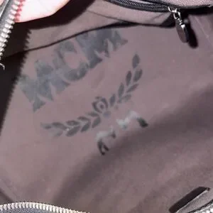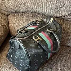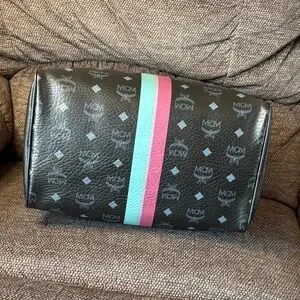 Chic MCM satchel in black. Features bold pink and teal stripe. Stylish and versatile. A Preowned MCM Visetos black Boston bag with dog bone charm. It is made in Korea.