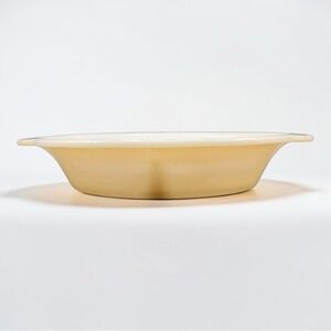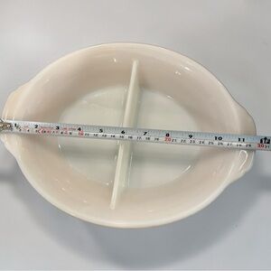 Fire King divided platter with two sections. Smooth cream finish for simple presentation. Sturdy ceramic construction for reliable use. Easy to pair with neutral tableware.
