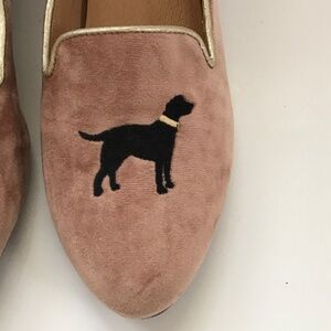 Velvet loafers with embroidered black dog motif. Gold piping trim. Leather-lined interior with Jack Rogers branding. Slip-on flat style. Elegant and playful design.