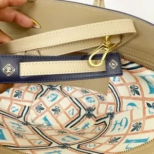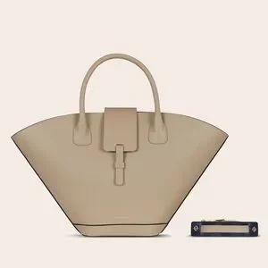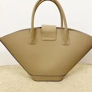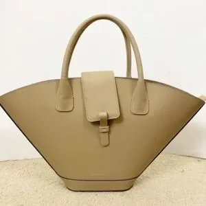 Elegant tan leather tote with structured silhouette. Smooth finish and secure front tab closure for a polished look. Comfortable top handles for easy carrying. Neutral tan complements any wardrobe and daily outfits.