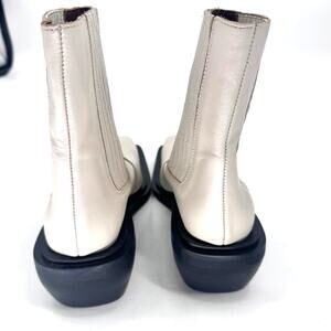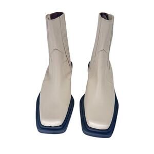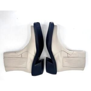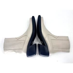 ✿ Features: These ivory leather cowboy ankle boots have a modern, more structured spin on the classic cowboy style. They are crafted from shiny black leather and have a chunky Cuban heel and stacked rubber soles. They also feature gusseted sides for more comfort and textured appeal.