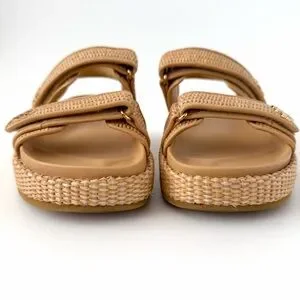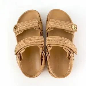 Tory Burch Kira raffia platform sport sandals featuring woven raffia straps, adjustable hook-and-loop closures, and signature double T logo hardware. The raffia wrapped platform adds a natural coastal look while the cushioned footbed makes them comfortable for everyday wear.