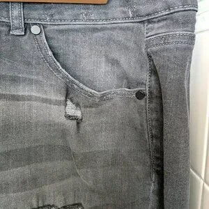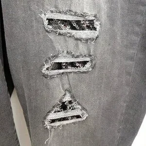 These jeans are comfy and unique! I love the sequin inserts. I'm only selling them because they don't fit anymore. They are a light black/gray distressed color, and the sequin inserts are black.