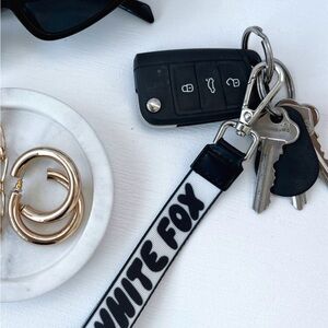 Wristlet strap with bold WHITE FOX lettering. Sturdy metal clip for easy attachment. Leather-reinforced end for added durability. Sleek, modern accessory for keys or cards.