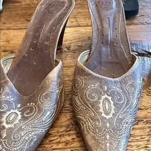 PAZZO slip-on mules with pointed toes. Decorative embroidered pattern on the upper. Mid-height slender heel for a dressy look. Smooth lined interior for comfortable wear.
