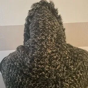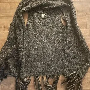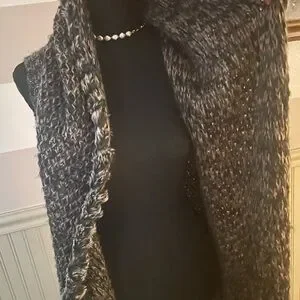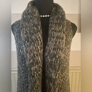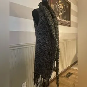 Stylish long knit vest by Escio in excellent condition. Features a cozy open-front design, soft textured knit in black, gray, and brown tones, plus chic fringe detailing along the hem. Perfect layering piece for adding warmth and style to any outfit. Size Small.