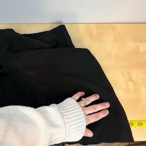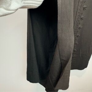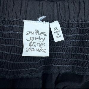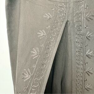Beautiful flowy black pants from Parsley & Sage featuring tonal embroidered detailing down the front panels. The relaxed wide-leg silhouette and soft drape give them an effortless boho, art-to-wear feel.