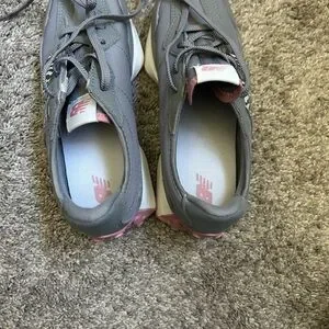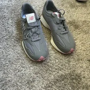 Light gray New Balance 327 sneakers with pink trim. Lace-up design and cushioned insole. Clean retro-inspired profile with subtle branding on the tongue.