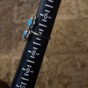 Vintage Navajo Turquoise and Sterling Silver Ring Size 7 Native American Jewelry. It is not marked to silver content, but test positive for sterling silver. The double turquoise stones are bezel set framed with curled wire. The band has a cold chisel split shank. The turquoise has nice color and matrix. The condition is excellent