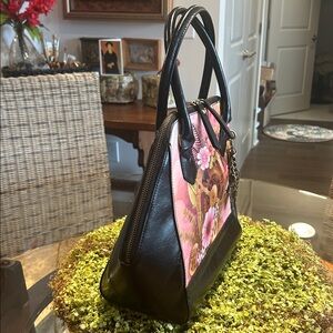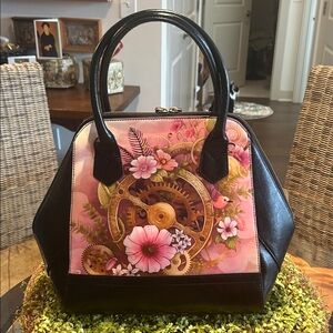 Sharif Wearable Art Pink Floral & Gear Design Leather Satchel 15”x 11”x 4” NWOT