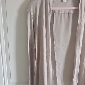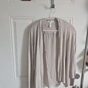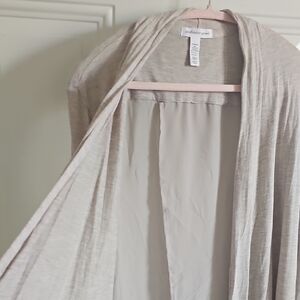 Soft draped open-front cardigan by Ambiance. Lightweight knit ideal for layering. Long sleeves with relaxed silhouette. Neutral taupe tone for versatile styling.