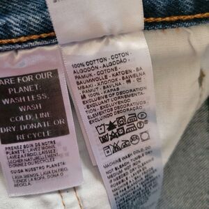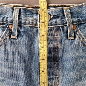 Classic Levi's denim shorts with a high-rise fit. Distressed details and frayed hem. Five-pocket styling with copper-tone hardware. Casual, worn-in blue denim look.