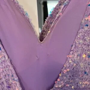 Sparkling lavender sequin mermaid cut gown with a V-neck and thin straps. Fitted silhouette with a front slit. Shimmery finish ideal for formal events. Has some tan streaks on the inside