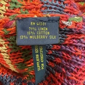 Ralph Lauren classic knit sweater with bold red trim. Multicolor striped fair isle-style pattern. Crew neckline and long sleeves. Soft textured knit fabric.