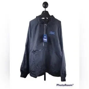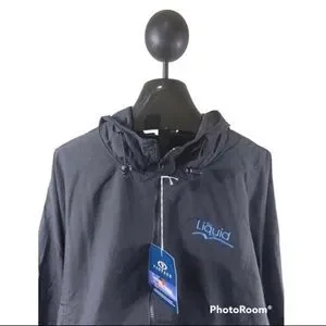 NWT Vantage Apparel Hooded Windbreaker Packable Pullover Jacket Men's Size Large. Light-weight hoodie, breathable, athletic, customed logo, embroidered the liquid bar logo, big zipper kangaroo pouch front pocket, big open side hand pockets, adjustable hood cord and adjustable hem cord, loose/baggy/oversize fit, elastic cuffs, solid black, long sleeves, outerwear, fall, winter, outdoorsy, shell and lining 100% nylon.