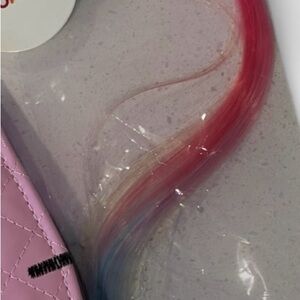 Charming Hello Kitty set with a pink quilted crossbody bag. Includes heart-shaped pop-it, pink hairbrush, and colorful hair extension.