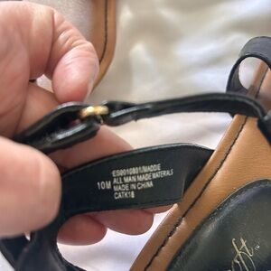 Stylish black T-strap sandals with a cushioned tan footbed for all-day comfort. Adjustable ankle strap and gold-tone buckle deliver a secure, polished fit. Versatile design that pairs easily with casual and dressy looks.