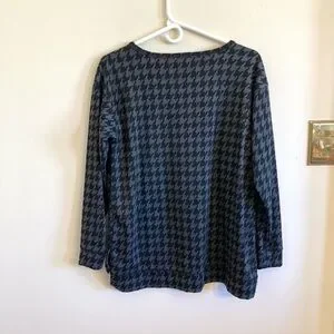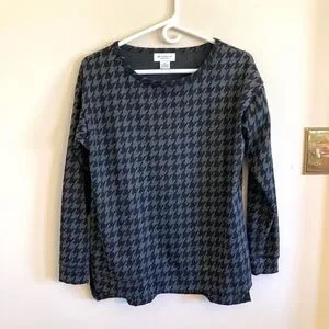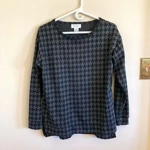 This Liz Claiborne long sleeve top with classic houndstooth pattern is in excellent condition. Quality material that is 85% polyester, 13% rayon, and 2% spandex. Relaxed silhouette for easy everyday wear. Neutral black and gray tones pair well with many bottoms. The length measures 25” in front and 26” in back. Across the chest measures approximately 20”. The size is Medium. No smoking home.
