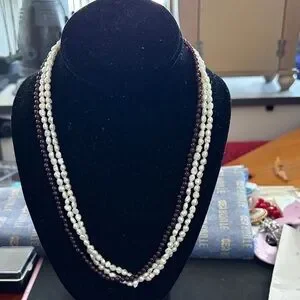 Vintage Three -Strand White Rice Pearl and Garnet Bead Necklace