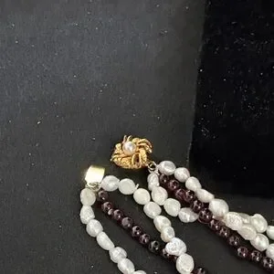 Classic three-strand necklace featuring lustrous white race pearls paired with rich garnet-red beads. Elegant layering that enhances both everyday and evening outfits. Lightweight design for comfortable wear and a refined, timeless look.