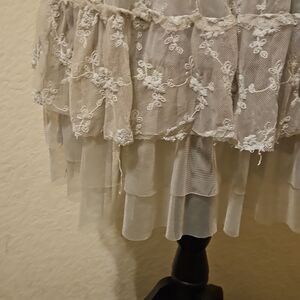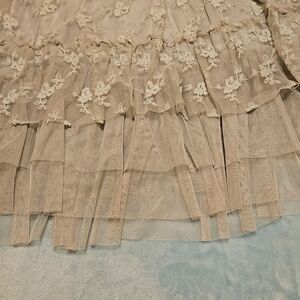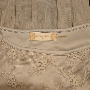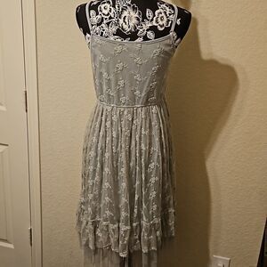 Gorgeous Altar'd State grey lace & crocheted dress with 3 tiers of tulle for bottom hem. Adjustable straps. Size Medium. 100% polyester. EUC with zero call outs that I have seen. Perfect for Prom or date night! Pair with a blazer, cowboy hat and boots or silver high heels and satin crop jacket! Very versatile piece to add to your wardrobe!
