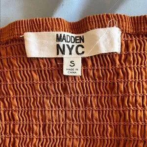 Madden NYC rust crop bustier with a front zipper closure. Structured cups and ruched short sleeves create a flattering, on-trend silhouette. Perfect for pairing with high-waist jeans or skirts for day-to-night looks. Gently used, worn once or twice