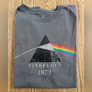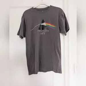 Vintage-style Pink Floyd graphic tee. Charcoal gray base with black prism and white text. Features a vibrant rainbow spectrum accent. Soft cotton look. Classic rock band graphic.
