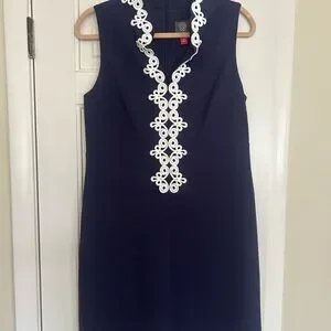 Vince Camuto Navy Sheath Dress with White Lace Front Trim