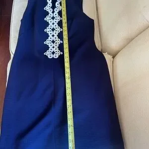 Sleeveless navy mini dress featuring a decorative white lace trim down the front and at the neckline. Tailored shift silhouette for a polished look. Easy to style for day or evening.
